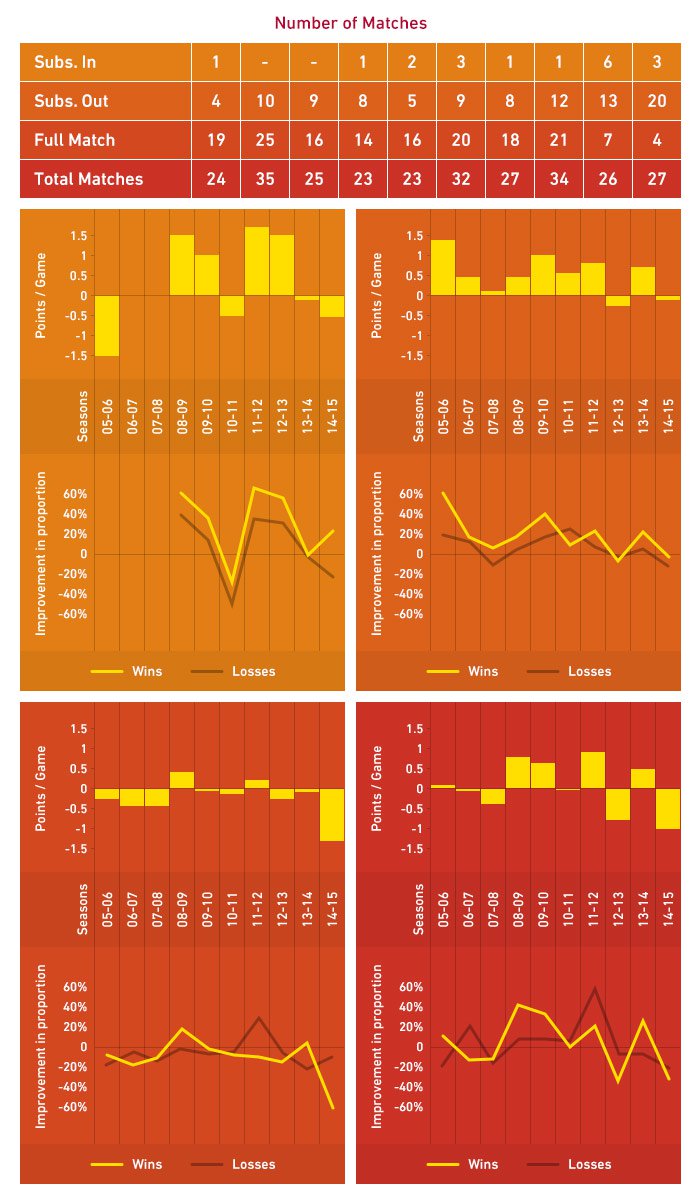 Obrázek výše ukazuje statistiky během sezóny v rámci každého ze 4 zmiňovaných Tottiho příspěvků v utkání ( hrál jen část zápasu, hrál celý zápas, hrál zápas a v jeho průběhu byl vyměněný za jiného hráče, nehrál zápas a v průběhu zápasu do něj nastoupil).