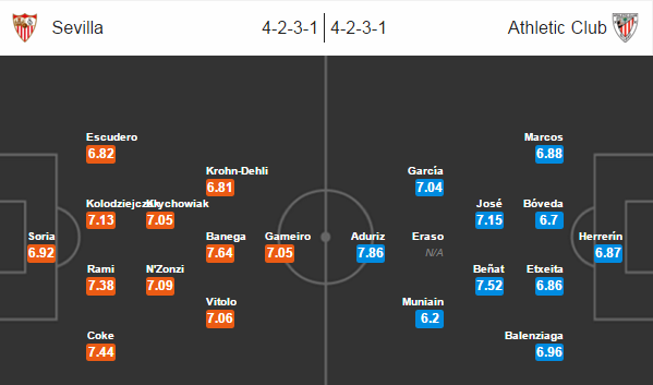 | Sevilla se bude muset ve čtvrteční odvetě čtvrtfinále Evropské ligy obejít bez zraněného Andreolliho a Tremoulinase. Otazník visí rovněž nad Danielem Carricem. Do základní sestavy se naopak vrací Kevin Gameir, který dostal o víkendu volno. | Na Seville se z kádru Bilbaa s jistotou nepředstaví zraněný Williams. Napravo by tak v záloze měl nastoupit Raul Garcia. Chybět bude rovněž Laporte a Merino. |