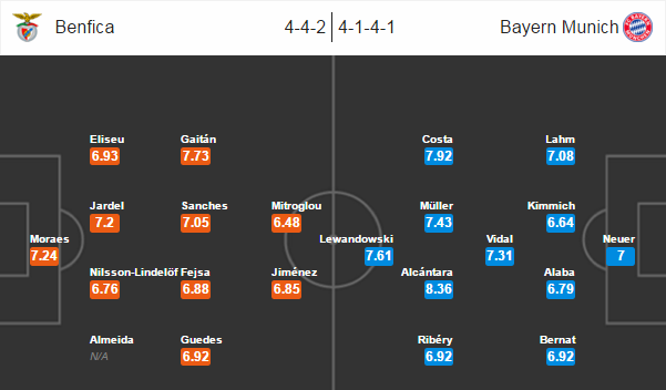 | Domácím bude z důvodu disciplinárního trestu chybět Jonas, který tuto sezonu nastřílel ve všech soutěžích dohromady nejvíce ze všech hráčů v Evropě (30). Útočnou dvojici by tak měl vytvořit Kostas Mitroglu a Raúl Jimenez, který se o víkendu v lize trefil hned 2x. Po téměř půlroční pauze se do zápasového vytížení vrací Luisao, který o víkendu zasáhl z lavičky do utkání s Academicou, které Benfica vyhrála 2:1. Jeho středeční start v základní sestavě je však téměř vyloučený. Stoperskou dvojici by tak měli i pro tentokrát vytvořit Nilsson-Lindelof a Jardel. | Sestava Bayernu bude pravděpodobně totožná s tou, která minulý týden na domácí půdě porazila Benficu 1:0. Po víkendovém odpočinku se tak do základní sestavy vrátí Philipp Lahm, Douglas Costa i Thomas Muller. |