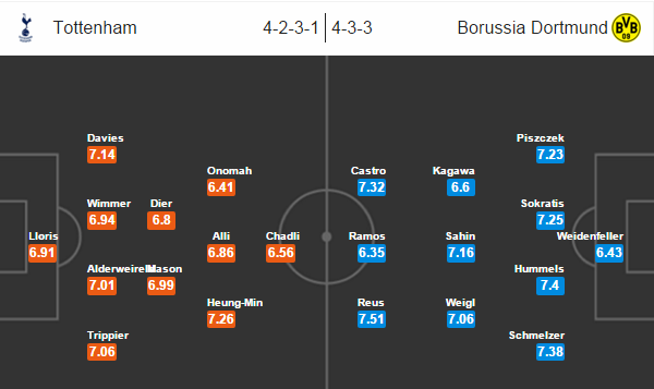 | Po odpykání disciplinárního trestu se pravděpodobně rovnou do základní sestavy vrátí Dele Alli. Na lavičce by měl ve čtvrtek začít Harry Kane. Nepravděpodobný je start od 1. minuty i v případě Christiana Eriksena a Mousy Dembeleho. | V případě Dortmundu nejsou v současné chvíli známy žádné 100% absence, nicméně otazník visí nad startem Erika Durma, Ilkaye Gündogana a Svena Bendera. Borussia má z úvodního utkání (3:0) komfortní náskok a lze proto předpokládat, že Thomas Tuchel do odvety mírně obmění sestavu, aby některým hráčům ulehčil a dopřál jim odpočinek pro náročný program v Bundeslize. |