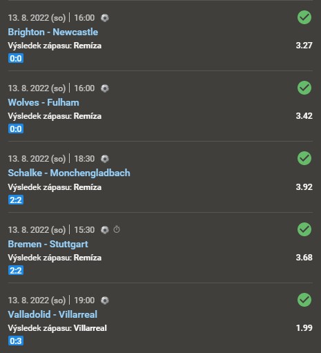 Další dva zápasy začínaly v 16:00 a ani v jednom ze zápasů Brighton vs. Newcastle a Wolves vs. Fulham nebyla k vidění žádná branka. Jelikož na tiketu byly u těchto sázek tipovány remízy, tak i tyto sázky zezelenaly.