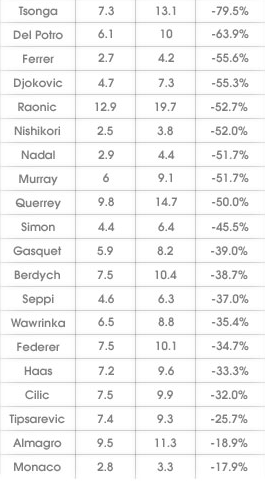 (Hodnoty jsou seřazeny v pořadí: hráč, esa na antuce, esa na tvrdém povrchu, % změna.)