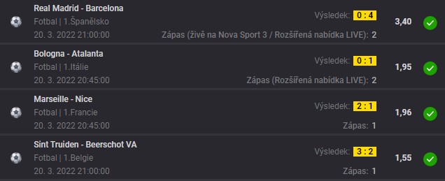 Sázející u Fortuny vsadil za 100 tisíc Kč šest fotbalových utkání, které se hrály v neděli (20. března). První zápas měl výkop ve 20:45, ten poslední na tiketu přesně o hodinu později. Kurz je v tomto díle nižší a to ”jen” 52,98, ale s ohledem na výši vkladu a výhru je tento tiket upřednostněn před jinými s vyššími kurzy.
