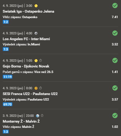 Hned první příležitost na tiket byla na výhru Ostapenkové proti Swiatek. Kurz byl u této příležitosti 7.41. Loni vyhrála Swiatek dva grandslamy včetně US Openu. Letos ovládla French Open (podruhé v kariéře), ale US Open se jí obhájit nepodařil, jelikož v osmifinále vypadla s lotyšskou hráčkou. Swiatek byla nasazenou jedničkou. V předešlých třech zápasech na US Openu ztratila jen devět gemů a po prvním setu (6:3) to vypadalo, že to bude další výhra pro polskou hráčku. Jenže vstup do druhého setu se Polce nepodařil a pak již přebírala otěže lotyšská hráčka, která nakonec v rozhodujícím třetím setu vyhrála 6:1. Ve kterém sebrala všechny čtyři podání soupeřce.