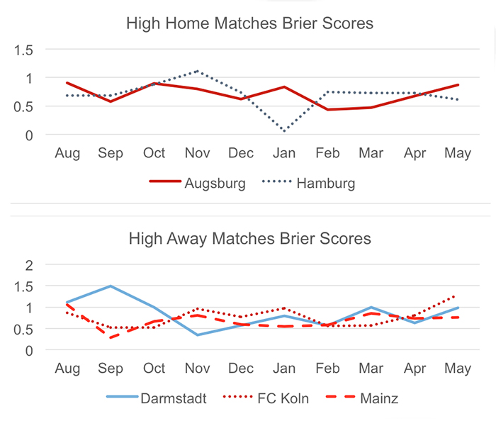 Příběh je téměř totožný s příběhem Hoffenheimu ve venkovních zápasech. Tento tým byl favoritem na vítězství pouze ve dvou případech a ani v těchto zápasech se mu vyhrát nepodařilo – proti Darmstadtu remizoval a s Hannoverem 96 prohrál. Celkově Hoffenheim venku prohrál 10 ze 17 zápasů, což znamenalo, že všechno se odvíjí tak, jak sázkovky předpokládaly. Odrazem je nízké Brierovo skóre.