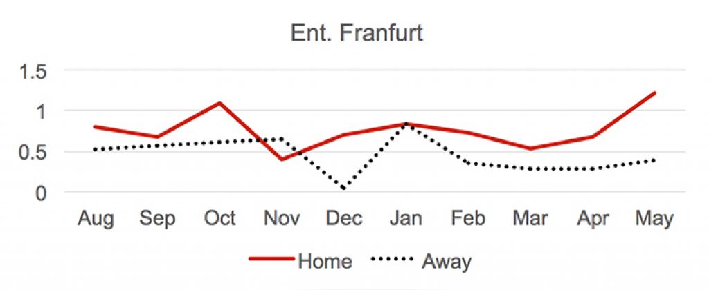 Když ovšem Frankfurt ostatní týmy hostí doma, dokáže hodně překvapit. Z deseti domácích zápasů, do nichž vstoupil jako favorit, vyhrál jenom tři. Naopak ze sedmi domácích zápasů, do nichž vstupoval jako outsider, vyhrál také tři a to včetně výhry proti Wolfsburgu (3:2) a proti Dortmundu (1:0).