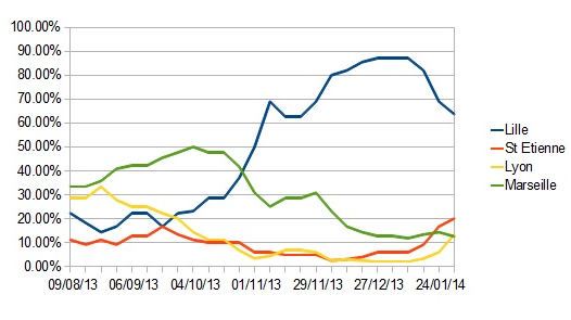 Navzdory poměrně jednoznačnému grafu je trochu otázkou, jak se budou vyvíjet další kola ligy, protože Lille poslední dobou vykazuje spíše sestupnou tendenci. Jeho rivalové naopak poměrně strmě stoupají.