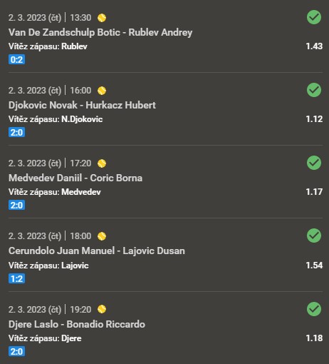 Vypisovat tady jednotlivé tipy ztrácí smysl, ale kurzy se u jednotlivých sázek pohybovaly od 1.12 do 2.21. Na tiketu se nacházely dva fotbaly z rumunské ligy, největší zastoupení měly tenisové utkání, kterých se na tiketu sešlo 18 a všechny byly trefené! Jenže sázející u šesti z nich využil právě jednu z možností uzavření příležitostí anebo cashoutu. Pět tipů bylo na basketbalové utkání, kde byl velice napínaný zápas ze švédské ligy.