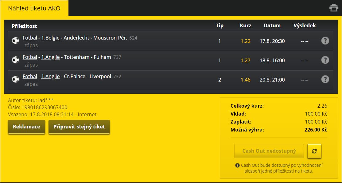 Ke každému tipu přidáváme všechny potřebné informace včetně nejvyššího nabízeného kurzu na českém trhu, který nám pomáhá vybrat srovnávač kurzů. Na konci článku pak najdete také připravený tiket.