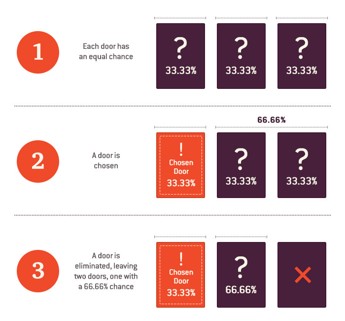 Pro výpočet těchto pravděpodobností je nejjednodušší si představit, že si vybíráte mezi původními dveřmi (33,3% pravděpodobnost) a spojenými pravděpodobnostmi dvou zbylých dveří (33,3 + 33,3%). Důvod je, že jakmile si vyberete dveře, zbylá dvojice dveří se spáruje – takže je 66,6% šance, že auto je za jedněma z těchto dveří. Jenže když jsou pak jedny z těchto dveří odstraněny, stále zbývá 66,6% šance na to, že auto leží za zbývajícími dveřmi.