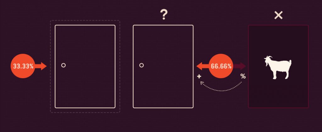 To je špatně – šance na výhru auta se po změně dveří zdvojnásobí. I přestože každé z dveří měly na původně na výhru vozu 33,3% šanci, jakmile se objeví první koza, pravděpodobnost, že se auto skrývá za zbývajícími dveřmi je 66,6%.