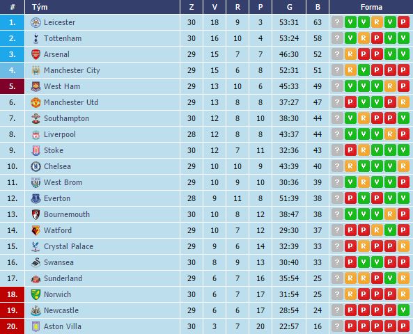 Sestup i nadále hrozí Sunderlandu a Norwich nebo Newcastlu, přičemž Aston Villa má už jen malou šanci ještě trochu vylepšit svou ostudnou bilanci, která je jen málokdy tak tristní jako tento rok (pokud vůbec někdy).