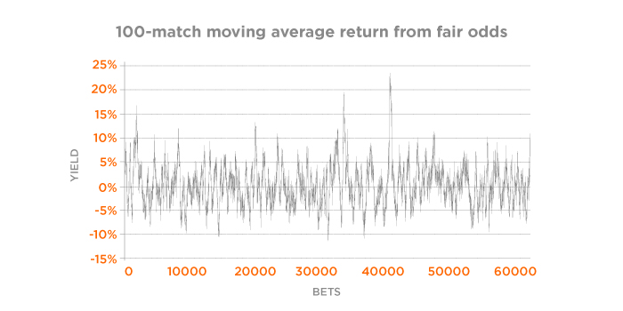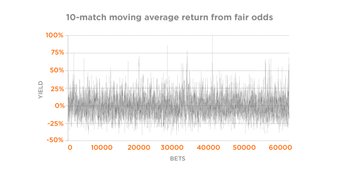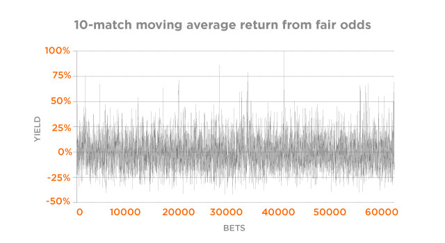 Na tomto místě by se dalo argumentovat, že tato analýza je spíše akademická. Nikdo slepě nesází na výhru domácích, remízu a výhru hostů, takže je to skutečně pravda. Nicméně pokud vezmete jakýkoliv vzorek vaší vlastní sázkové série, budete schopni najít v něm stejnou náhodnou variabilitu výnosů.
