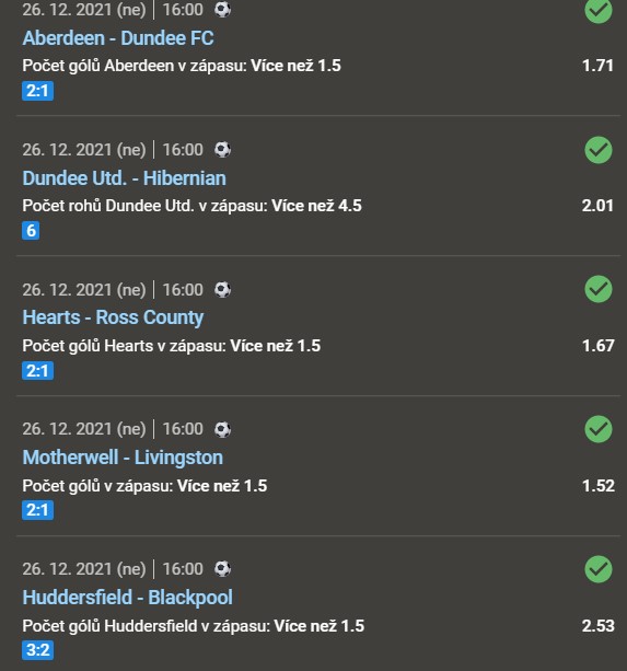 Šesté Dundee United, které naposledy bodovalo koncem listopadu, přivítalo Hibernian které se nacházelo na páté příčce a nedávno je v tabulce přeskočili. Zde byl tip na počet rohů domácího Dundee. V utkání měli šest rohů, sázejícímu stačilo rohů pět.