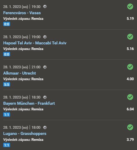 Sedm z osmi sázek byly tipy na remízy. Kurz se u tohoto tiketu vyšplhal na 142 134.81, vklad byl u této sázky 10 Kč a celková výhra 1 421 348,10 Kč.
