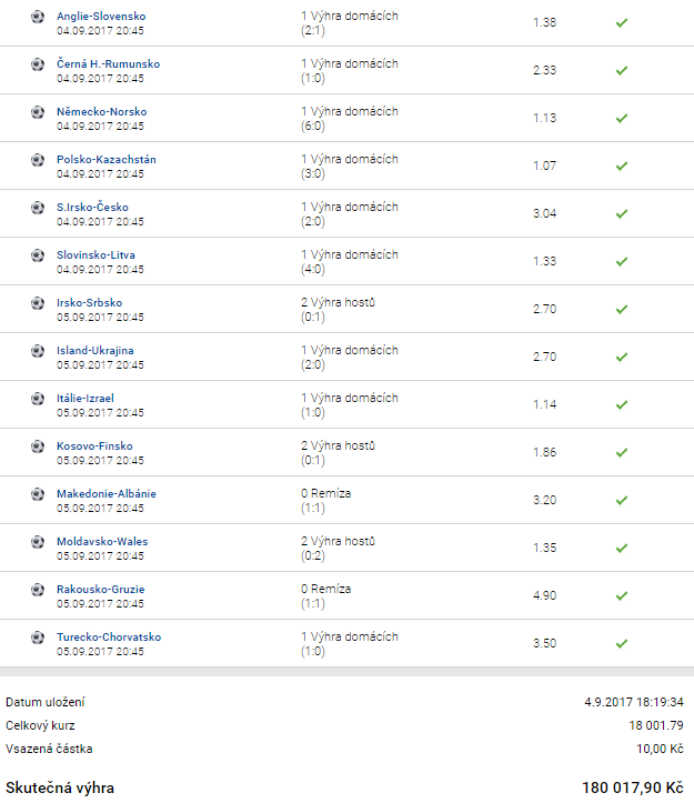 Co se dílčích kurzů týče, dostal se autor výše přiloženého tiketu poměrně na tenký led. Jednotlivé příležitosti totiž dohromady vytvořily poměrně dlouhý interval od mizivých 1,14 na výhru Itálie nad Izraelem, až po nepravděpodobnou (leč nakonec skutečnou) remízu Rakouska s Gruzií (4,9).