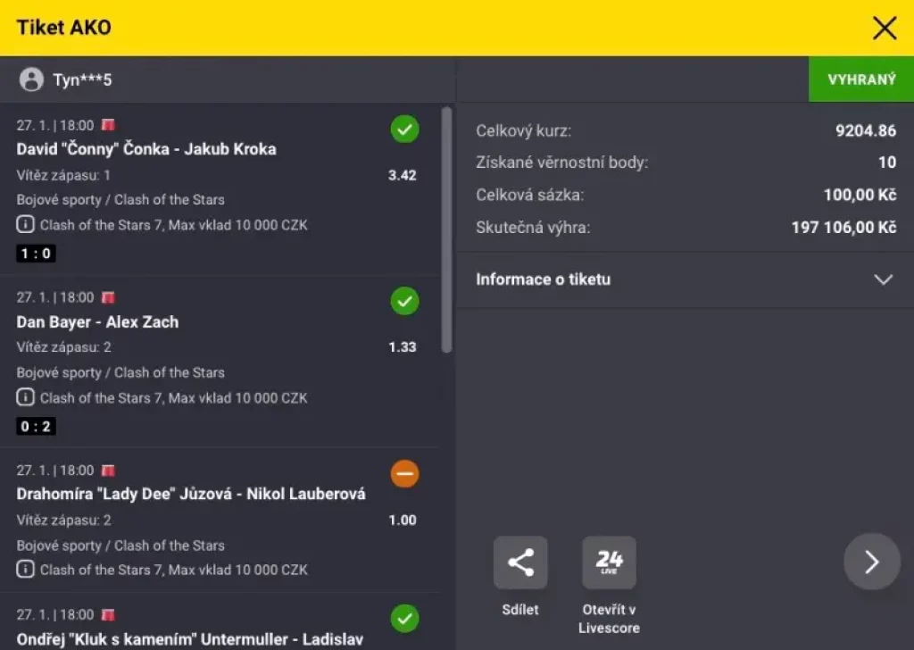 Hráčka, která se zaregistrovala u Fortuny právě před touto událostí, intuitivně umístila sedm tipů na svůj sázkařský tiket. Původní kurz přes 9 tisíc se sice snížil kvůli zrušení souboje mezi Lady Dee a Nikol Lauberovou, ale to nezabránilo dalším výhercům na tiketu dosáhnout úspěchu.
