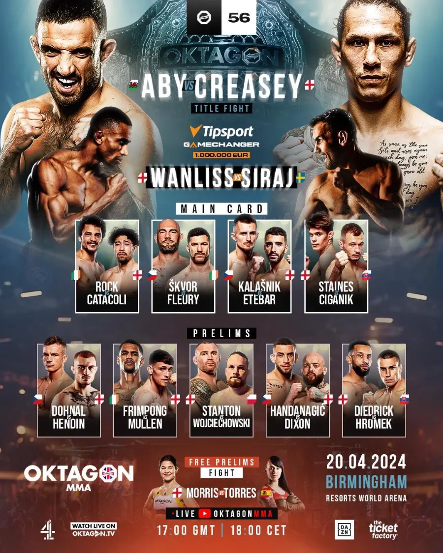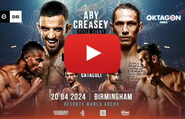 O pás šampiona se na Oktagon 56 utkají dva experti na brazilské jiu-jitsu a držitelé černých pásků – Aaron Aby a Sam Creasey. První zmíněný je považován za jednoho z vůbec nejlepších evropských fighterů v muší váze s impozantním rekordem šesti výher v prvním kole, z toho pět na submisi. Častěji však jeho zápasy končí na body. Aby je jedním z mála vrcholových sportovců trpících cystickou fibrózou. Mimo to překonal také rakovinu ve třetím stádiu. Přestože mu v Manchesteru titul unikl kvůli zastavení lékařem, v zápase byl jasně lepší. Nyní navíc půjde proti soupeři, se kterým už má zkušenosti.