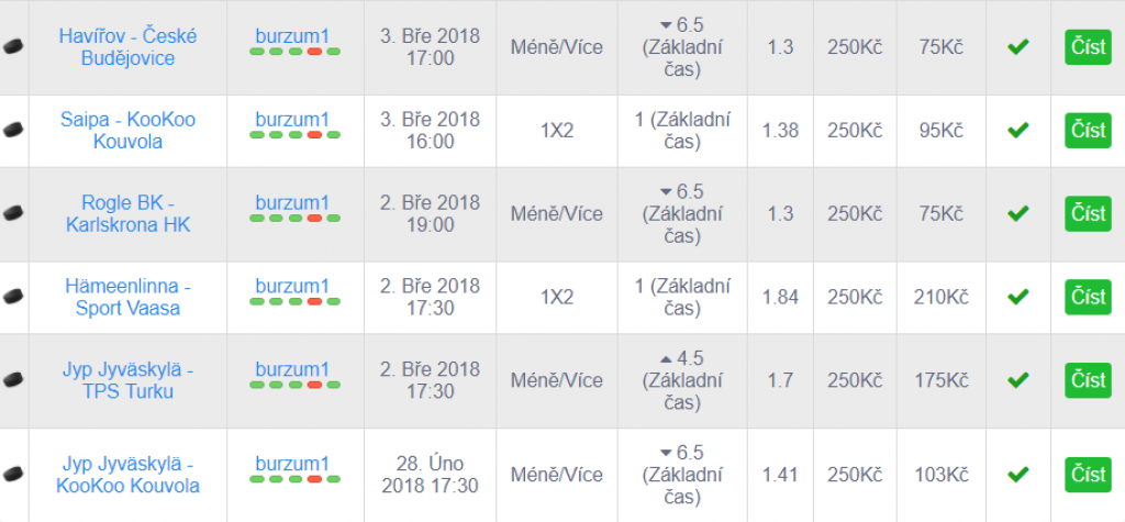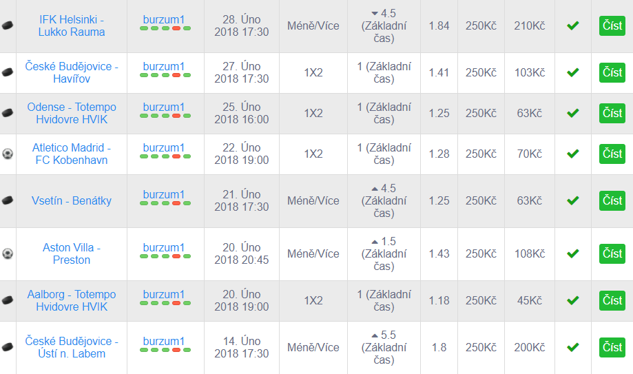 Burzum1 se v tipech nejčastěji věnoval sázce na výhru domácích v některých fotbalových ligách a sázce na počet gólů v hokeji.