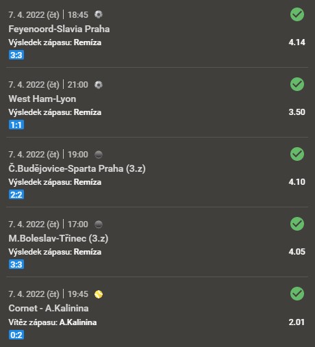 Neznámý sázející vsadil ve čtvrtek na šest zápasů, krom tipu na tenis a jednoho dvojtipu v utkání Evropské ligy, přidal ještě čtyři remízy, a to dvě ve fotbale a dvě v hokeji. Všechny zápasy se hrály ještě tentýž den.