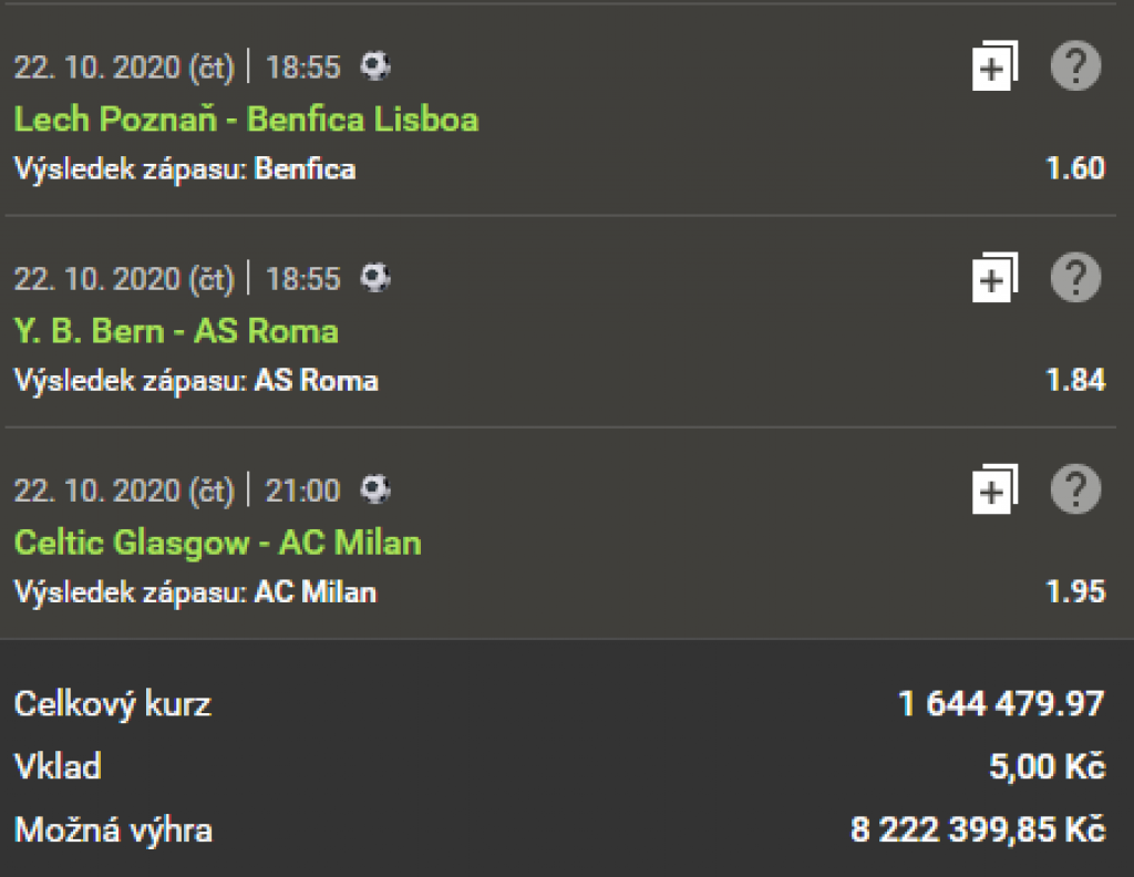 Následující tiket sestavil tipař s nickem milanosrabos. Všechny tipy se týkají sázky na zápasy evropských pohárů. Celkový kurz činí 1 644 479.97. To znamená, že za 5 vsazených korun můžete vyhrát přes 8 milionů.