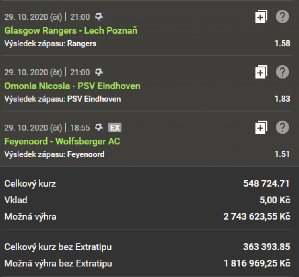 Následující tiket sestavil tipař s nickem marekkotlar. Všechny tipy se týkají sázky na zápasy Evropské ligy. Celkový kurz činí 548 724.71. To znamená, že za 5 vsazených korun můžete vyhrát přes 2,5 milionu.
