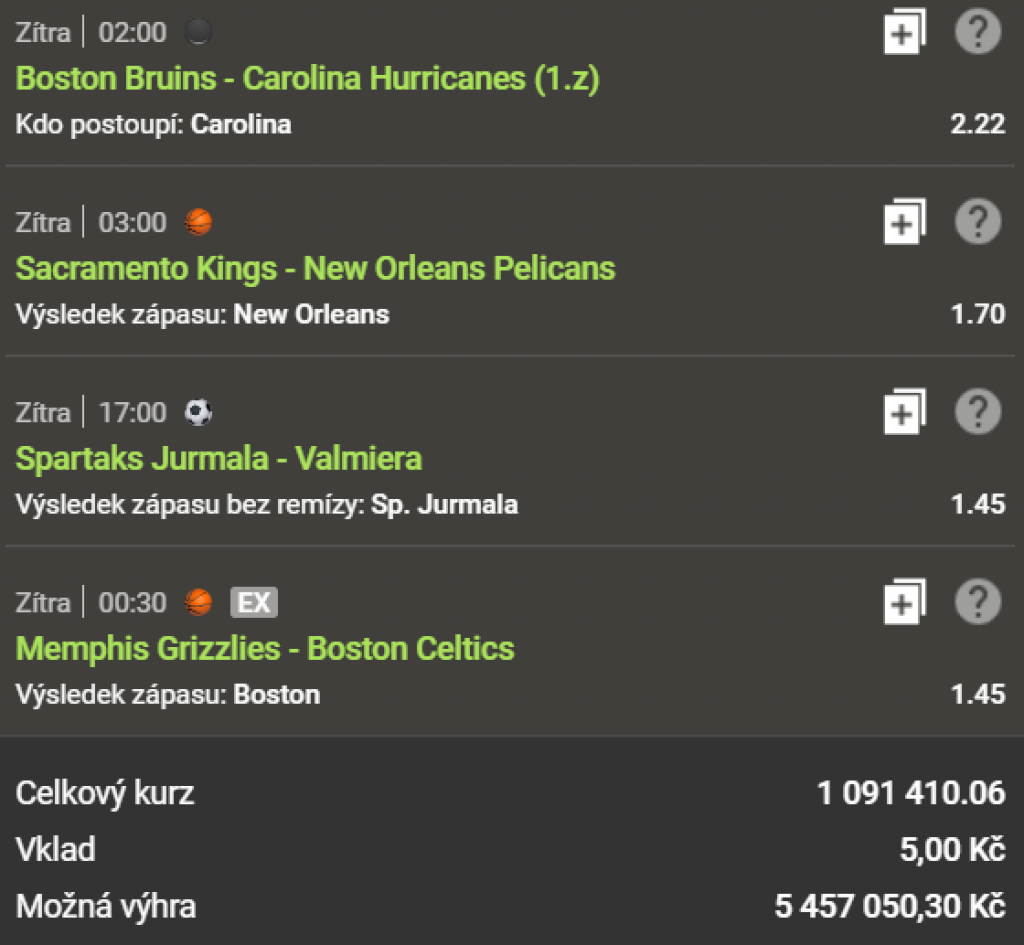Následující tiket sestavil tipař s nickem berny69. Najdete na něm 19 sázkových příležitostí. Celkový kurz činí 638 569.65. To znamená, že za 5 vsazených korun můžete vyhrát více než 3 miliony.