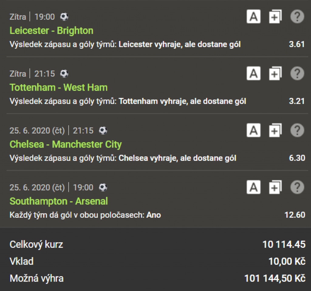 V dnešním díle naší sázkové loterie vás chceme seznámit s fotbalovým tiketem, který obsahuje celkem 6 sázkových příležitostí s celkovým kurzem 10 114.45. To znamená, že za 10 vsazených korun můžete vyhrát přes 101 tisíc.