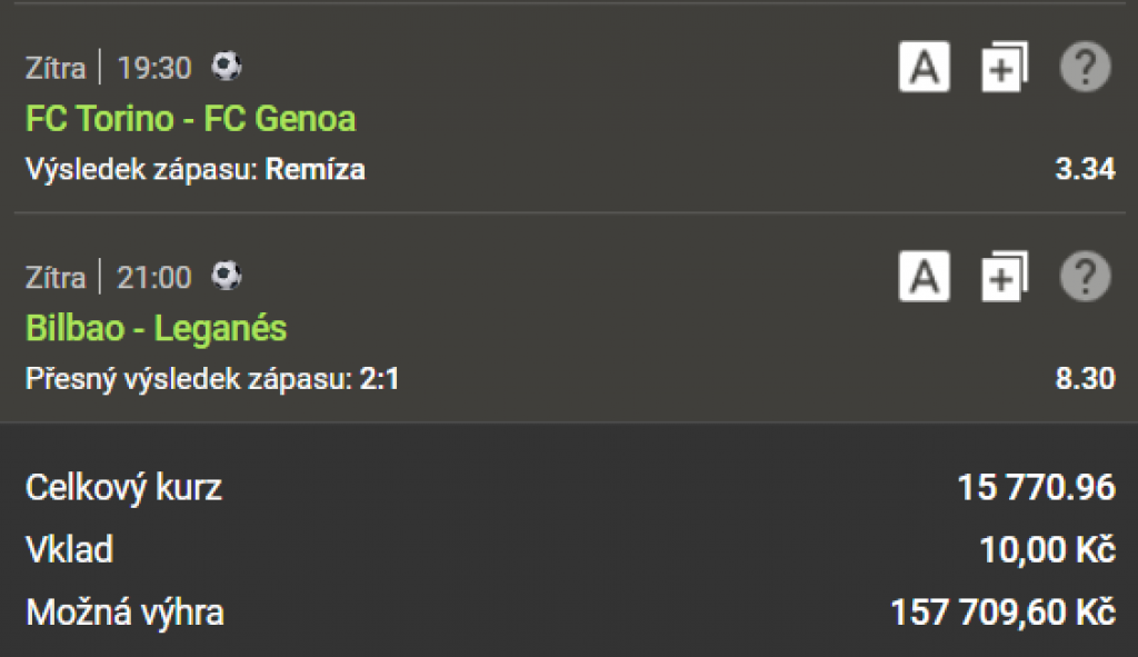 V dnešním díle naší sázkové loterie vás chceme seznámit s fotbalovým tiketem, který obsahuje celkem 8 sázkových příležitostí s celkovým kurzem 15770.96. To znamená, že za 10 vsazených korun můžete vyhrát přes 150 tisíc korun. Tiket byl inspirován tiketem hráče Fiala37, jenom byl z důvodu aktuálnosti upraven (byla z něj odstraněna jedna sázka).
