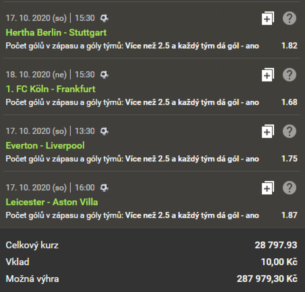 Následující tiket sestavil tipař s nickem Spajrou. Všechny tipy se týkají sázky na celkový počet gólů (over 2,5) a na to že oba týmy dají gól (ano). Celkový kurz činí 28 797,93. To znamená, že za 10 vsazených korun můžete vyhrát téměř 300 tisíc korun.
