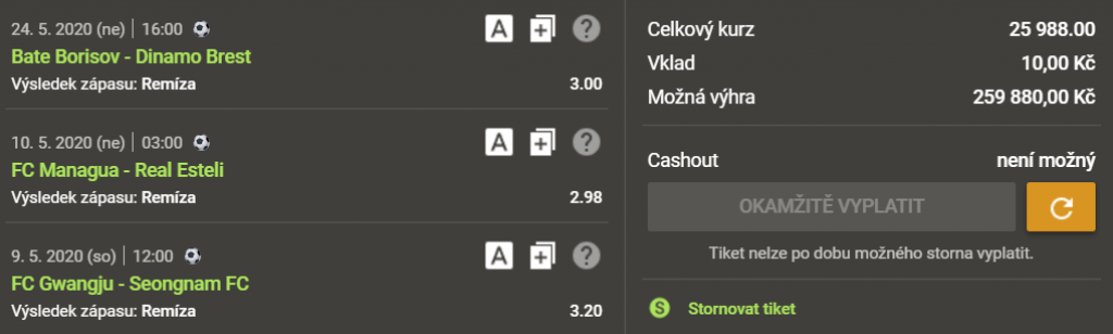 Pokud hledáte nějakou příležitost, která své štěstí poškádlit a dát mu příležitost, aby vám sedlo na lep, můžete se inspirovat níže přiloženým tiketem. Na tiketu najdete 9 sázkových příležitostí s celkovým kurzem 25 988. To znamená, že za každých 10 vložených korun můžete vyhrát přes 250 tisíc.