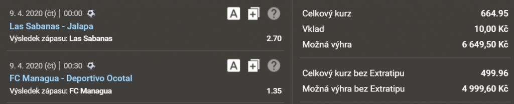 Pokud hledáte nějakou příležitost, která své štěstí poškádlit a dát mu příležitost, aby vám sedlo na lep, můžete se inspirovat níže přiloženým tiketem. Na tiketu najdete 11 sázkových příležitostí s celkovým kurzem 664.95. To znamená, že za každých 10 vložených korun můžete vyhrát přes 6 tisíc.