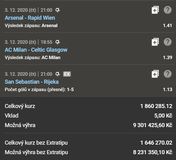 Následující tiket sestavil tipař s nickem “stergerits159”. Všechny tipy se týkají sázky na fotbalové zápasy z TOP evropských lig. Celkový kurz činí 1 860 285,12. To znamená, že za 5 vsazených korun můžete vyhrát přes 9 milionů korun.