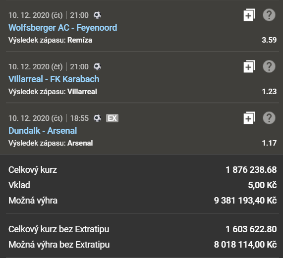 Následující tiket sestavil tipař s nickem “Biga468”. Všechny tipy se týkají sázky na fotbalové zápasy z TOP evropských lig. Celkový kurz činí 1 876238.68. To znamená, že za 5 vsazených korun můžete vyhrát přes 9 milionů korun.