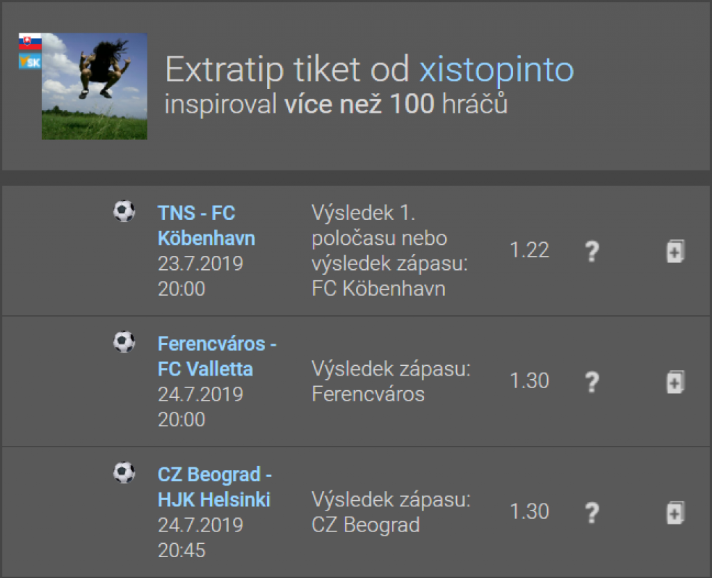 Za tiketem stojí známý tvůrce „plachet“ s nickem Xistopinto. Na tiketu najdete 28 sázkových příležitostí s celkovým kurzem 288,90. Kurz bez Extratipu pak činí 255,67. To znamená, že na každých 10 vsazených korun máte šanci vyhrát 2889, respektive 2556,7 korun.