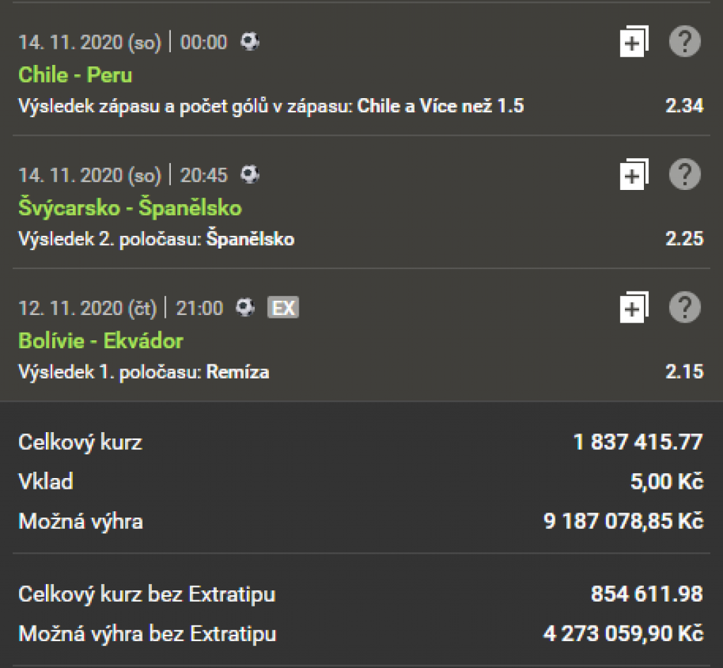 Následující tiket sestavil tipař s nickem favorit10. Všechny tipy se týkají sázky na zápasy mezinárodních pohárů. Celkový kurz činí 1 837 415.77. To znamená, že za 5 vsazených korun můžete vyhrát přes 9 milionů.