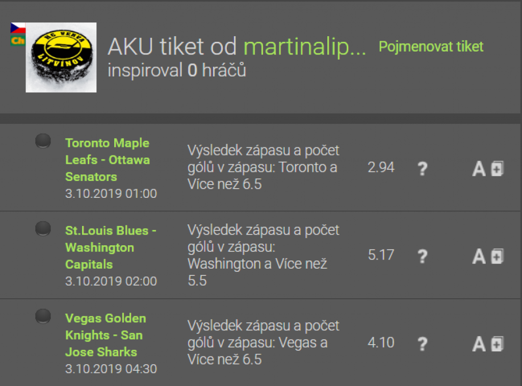 V tomto dílu naší sázkové loterie jsme vybrali tiket, který tvoří výhradně sázky na nejlepší hokejovou soutěž na světě. Tento tiket obsahuje celkem 8 sázkových příležitostí (dvojtipů na výhru jednoho z týmů a na počet gólů) a celkový kurz 111 275.30. To znamená, že za každých 10 vsazených korun máte šanci vyhrát 1 milion.