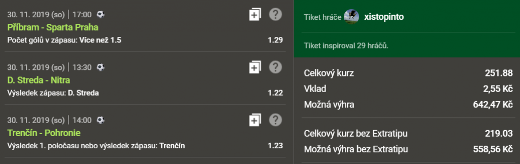 V dnešním díle naší sázkové loterie vás chceme seznámit s fotbalovým tiketem, který obsahuje celkem 30 sázkových příležitostí s celkovým kurzem 251.88. To znamená, že za 10 vsazených korun můžete vyhrát přes 2500 korun.