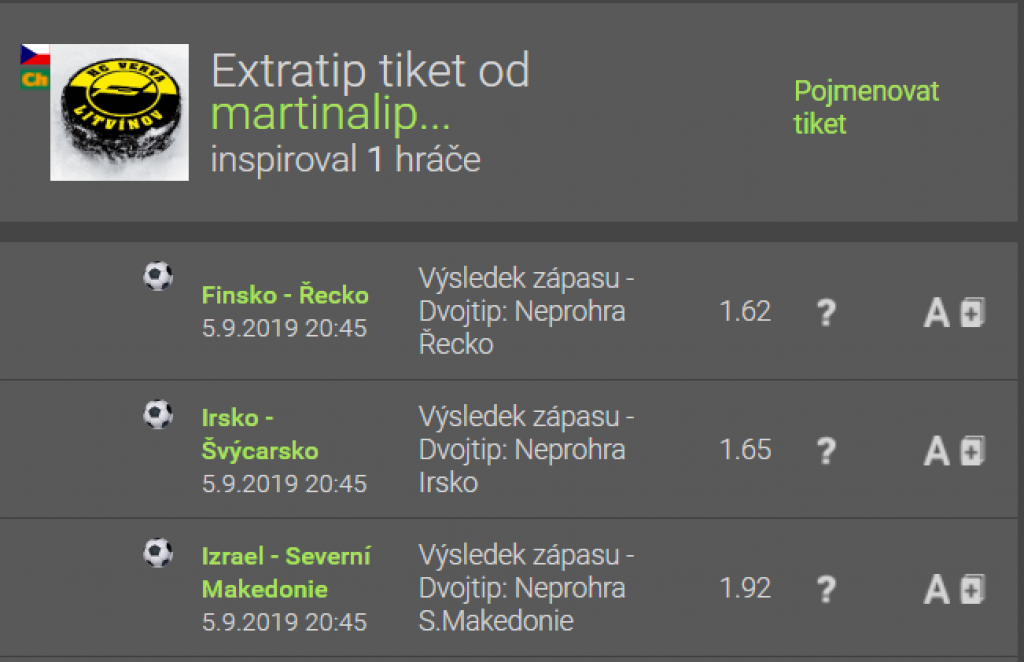 Do tohoto dílu našeho seriálu jsme vybrali tiket uživatele “martinalipertova”. Tento tiket obsahuje celkem 24 sázkových příležitostí, které dávají dohromady kurz 1 772 947,77 (1 303 638,06 bez Extratipu). To znamená, že za každou vsazenou korunu můžete vyhrát 1,7 milionu.