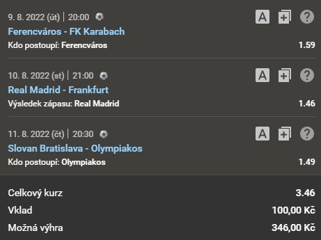 Následující tiket obsahuje tři sázkové příležitosti a patří k nejčastěji podávaným sázkám v českých sázkových kancelářích. Kurz je 3.46. Budeš věřit v moudrost davu a vsadíš si s námi?