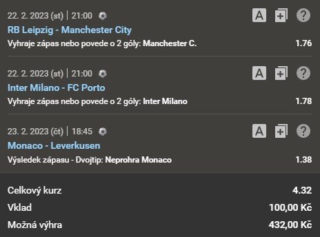 Následující tiket obsahuje tři sázkové příležitosti a patří k nejčastěji podávaným sázkám v českých sázkových kancelářích. Kurz je 4.32. Budeš věřit v moudrost davu a vsadíš si s námi?