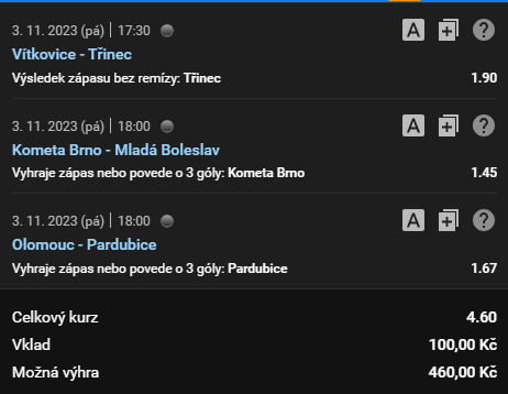 Následující tiket obsahuje tři sázkové příležitosti a patří k nejčastěji podávaným sázkám v českých sázkových kancelářích. Kurz je 4.60. Budeš věřit v moudrost davu a vsadíš si s námi?