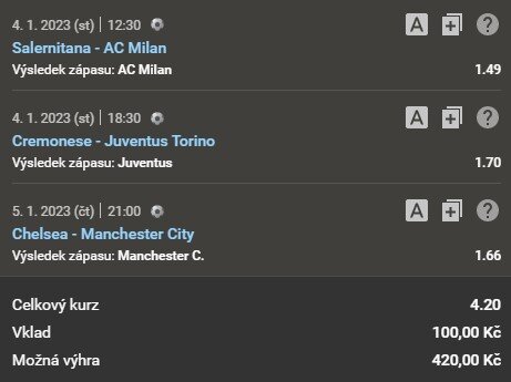 Následující tiket obsahuje tři sázkové příležitosti a patří k nejčastěji podávaným sázkám v českých sázkových kancelářích. Kurz je 4.20. Budeš věřit v moudrost davu a vsadíš si s námi?