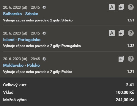 Následující tiket obsahuje tři sázkové příležitosti a patří k nejčastěji podávaným sázkám v českých sázkových kancelářích. Kurz je 2.41. Budeš věřit v moudrost davu a vsadíš si s námi?