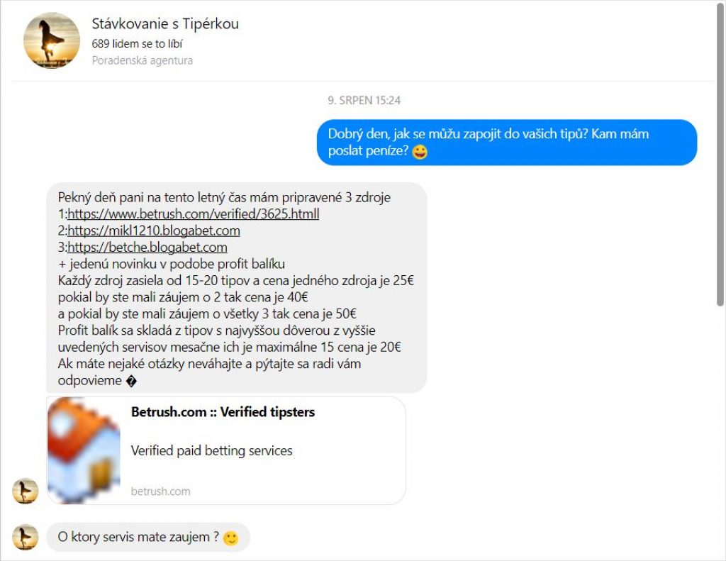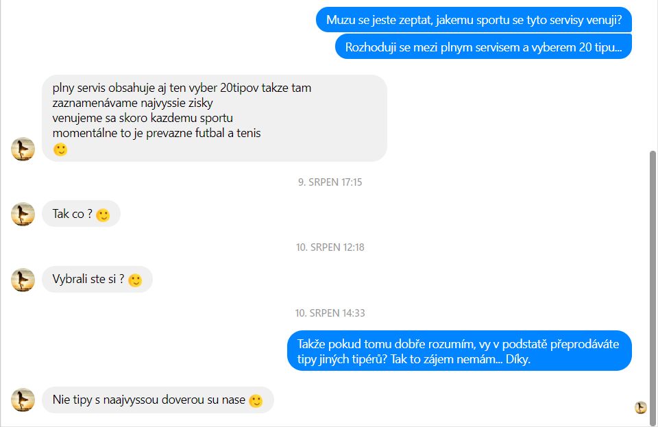 Sázkový servis se totiž nijak netajil tím, že „v létě poskytuje sázkové tipy od těchto vybraných tipařů“. Potom poslal odkazy na placené servisy v zahraničí včetně verifikovaných tipů. Když jsem se dotyčného zeptala, zdali tedy jenom přeprodávají tipy jiných sázkových servisů, tak mi bylo řečeno, že „základní balíčky přeposílají odjinud, ale ten premium balíček je složený z jejich vlastních tipů“. Tento servis se jmenuje “Stávkovanie s tipérkou” a dokládám i naši konverzaci na Facebooku: