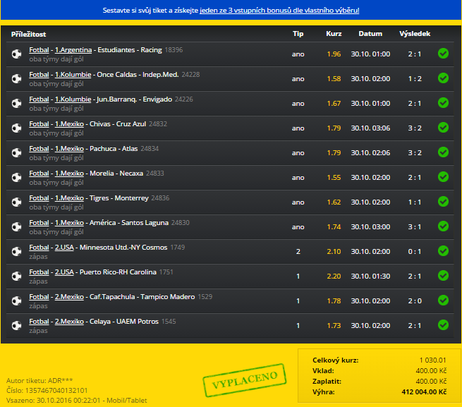 Vsadil 400 Kč na 12 fotbalových tipů z prostřední amerického kontinentu. Již samotný počet tipů je alarmující a sám o sobě nezakládá příliš velké šance na výhru. Tím spíš, že tucet kurzů z intervalu od 1,55 do 2,20 dalo po vzájemném vynásobení dohromady celkový kurz 1 030,01!