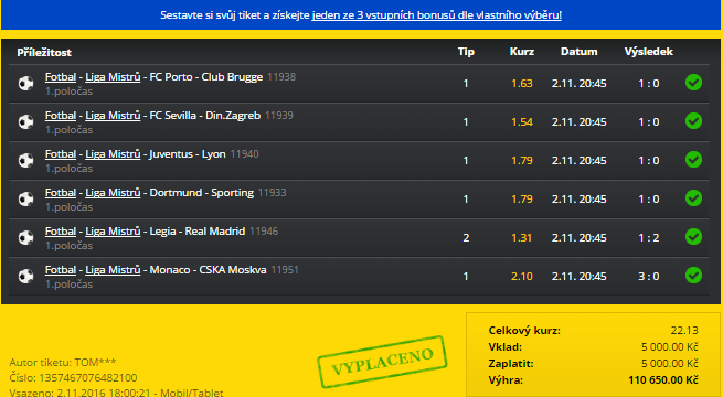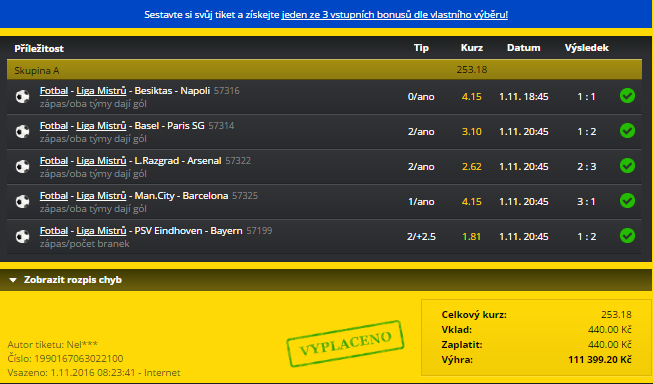 Online sázející s nickem Nel***, který své tikety podává právě u zmíněné, jedné z největších sázkovek působících na českém trhu, vsadil 440 Kč v celkovém kurzu 253,18 na pětici zápasů základních skupin Ligy mistrů, které se hrály minulé úterý.