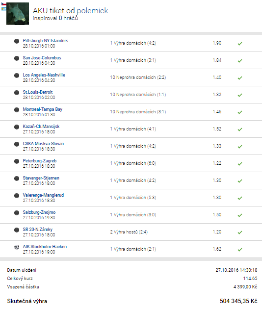 Ten k 12 hokejovým tipům snad symbolicky připojil i jednu fotbalovou sázku. Na (ne)šťastnou třináctku, která dohromady vytvořila celkový kurz 114,65, se rozhodl vsadit 4 399 Kč. A jak se nyní ukazuje, škoda, že nevsadil ještě víc!