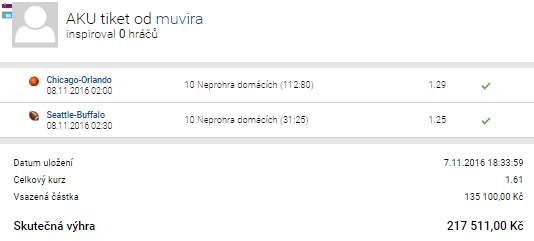 Stejně jako patří mezi “luckery”, kteří si v uplynulých 7 dnech přišli díky sázení na velice sympatickou částku! Díky vkladu oněch 135 papírů na celkem dvě neprohry, které mu vzhledem k minimálním dílčím kurzům utvořily přijatelný celkový kurz 1,61, si přišel na výhru 217 511 korun.