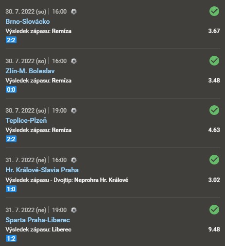 Neznámý sázející se u Tipsportu zaměřil na šest z osmi Fortuna:ligy prvního kola. Oproti TOP5 ligám začala česká liga s týdenním až dvoutýdenním předstihem. Kurzy se na tiketu pohybovaly od 3.02 do 9.48.